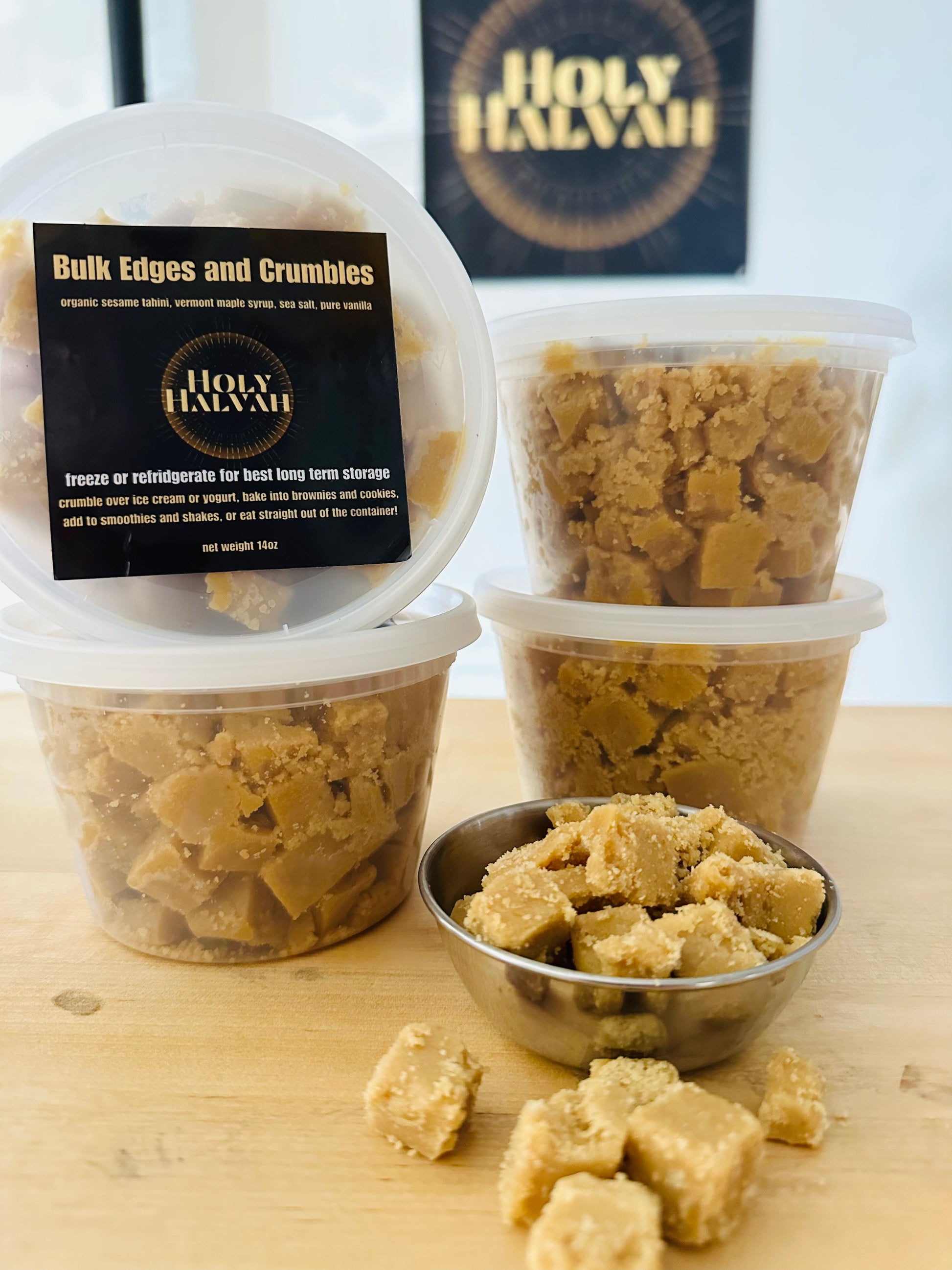 Every batch of our GoldBar Halvah creates deliciously imperfect trimmed edges, shards, and crumbles. Perfect for baking into brownies, blending into smoothies, sprinkling over granola or ice cream, or stuffing into dried dates—or simply enjoying straight from the bag! Get nearly a pound of these rich, nutty gold sesame halvah pieces at almost wholesale pricing. Your sealed container of ends won't be pretty, but that won't stop you from enjoying it!